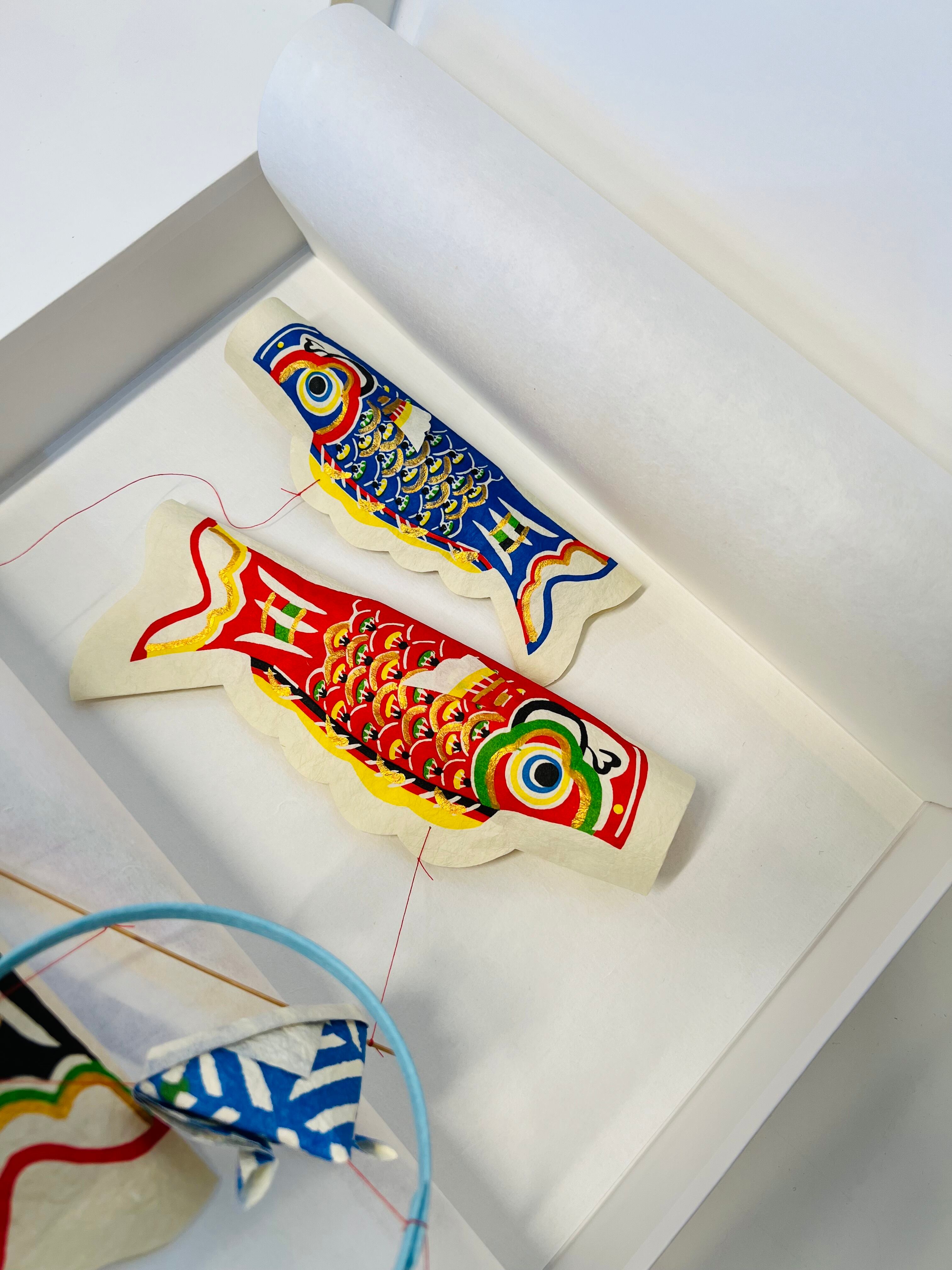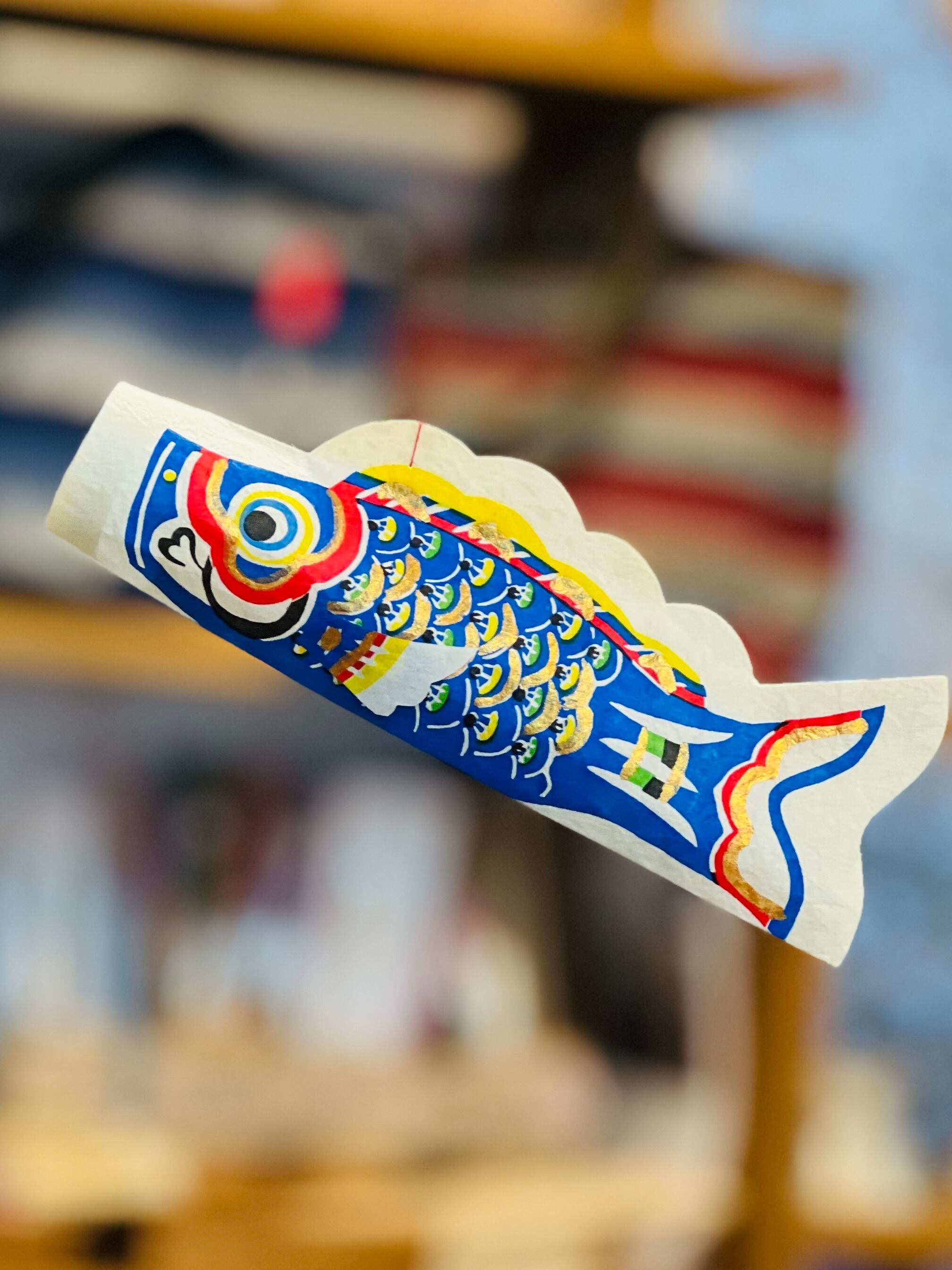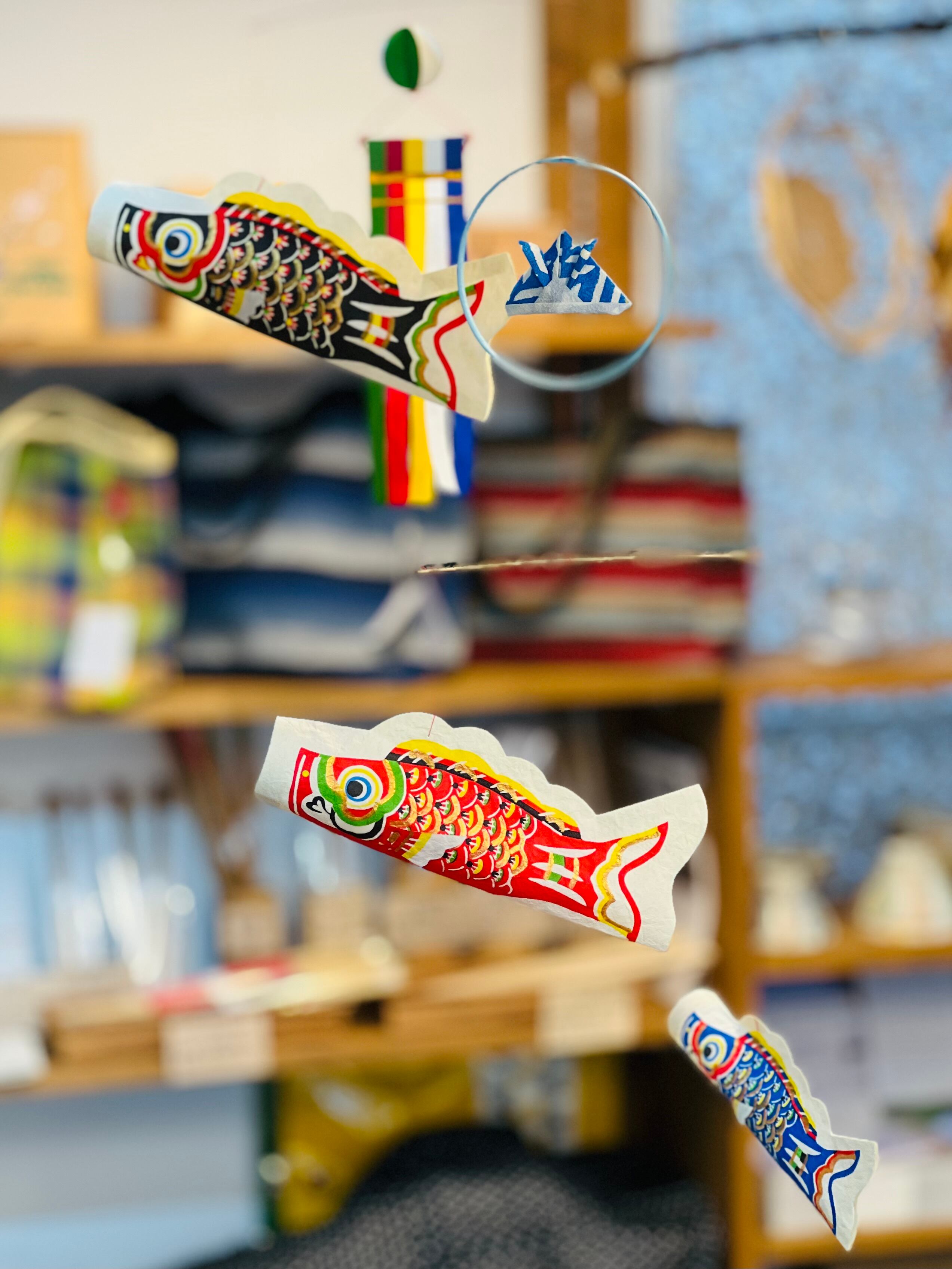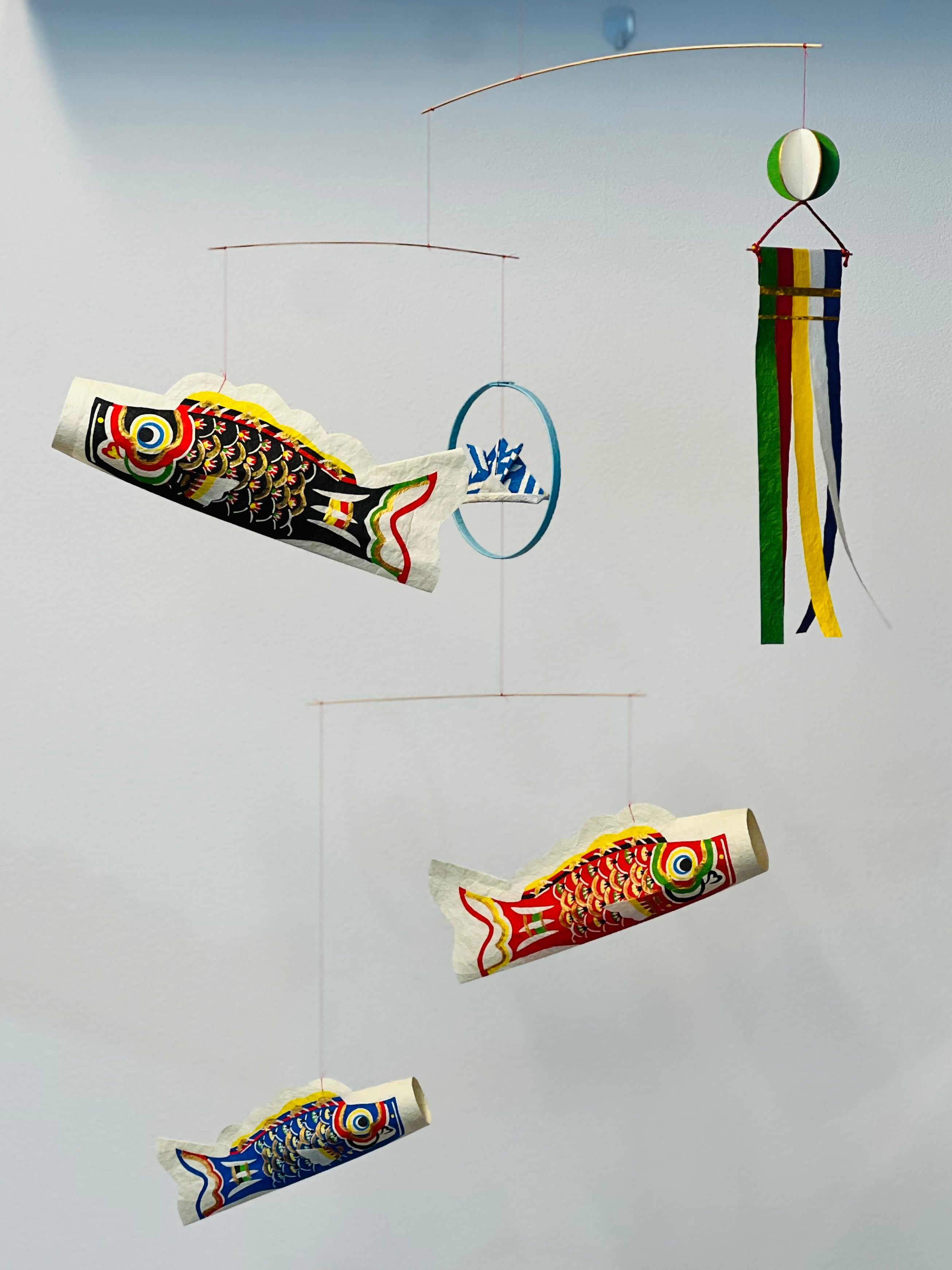 ひとつひとつ模様をつけられた和紙と、繊細な竹ひごで作られた和紙のモビールです。わずかな風を受けてゆったりとした鯉が優雅に泳いでいるように見えます。