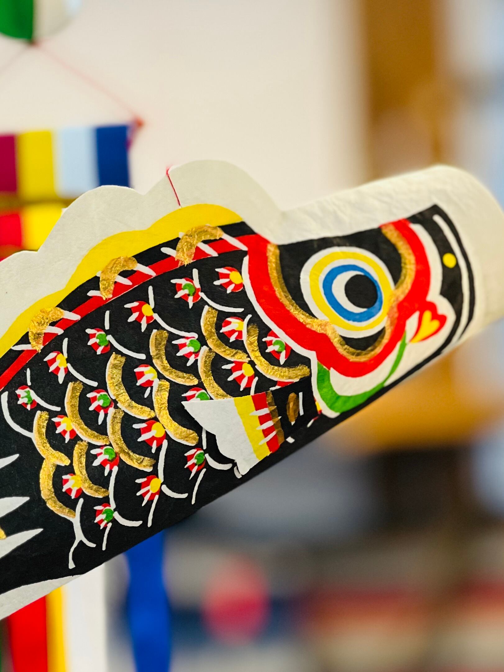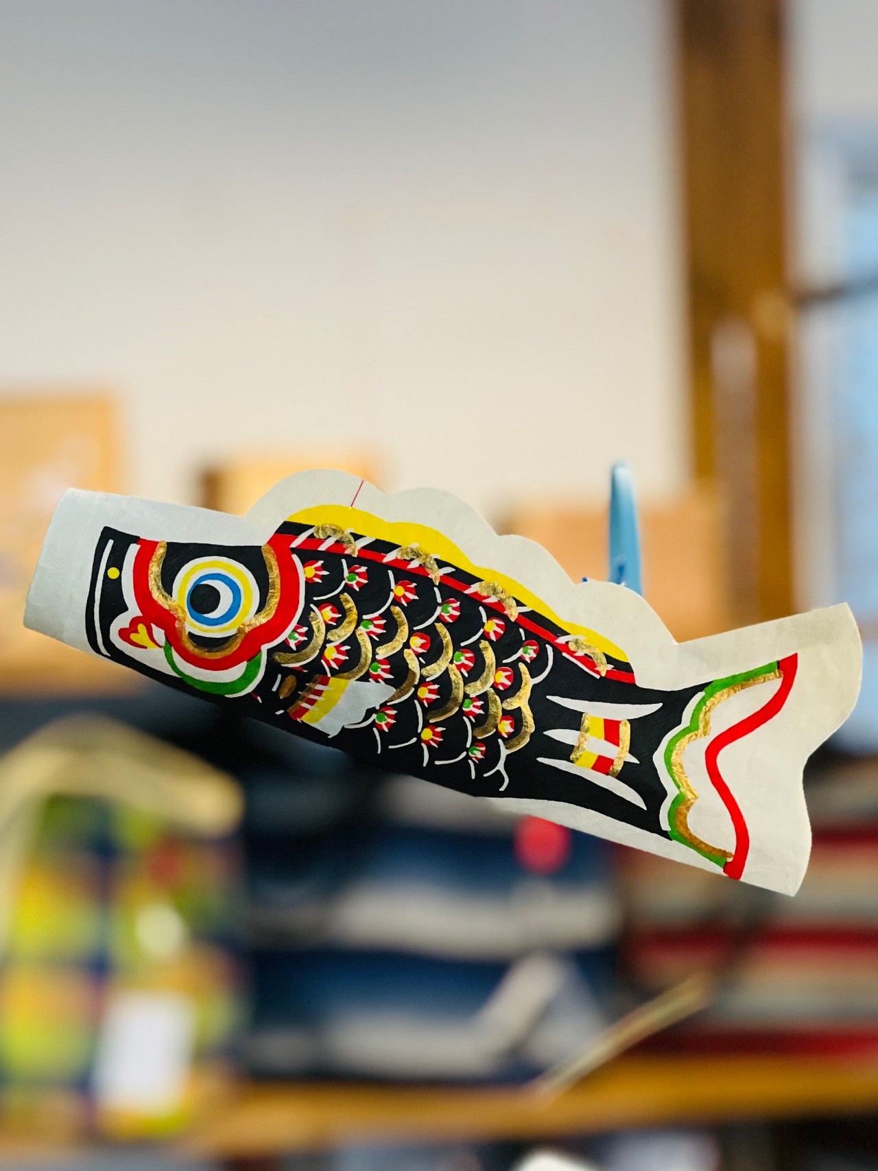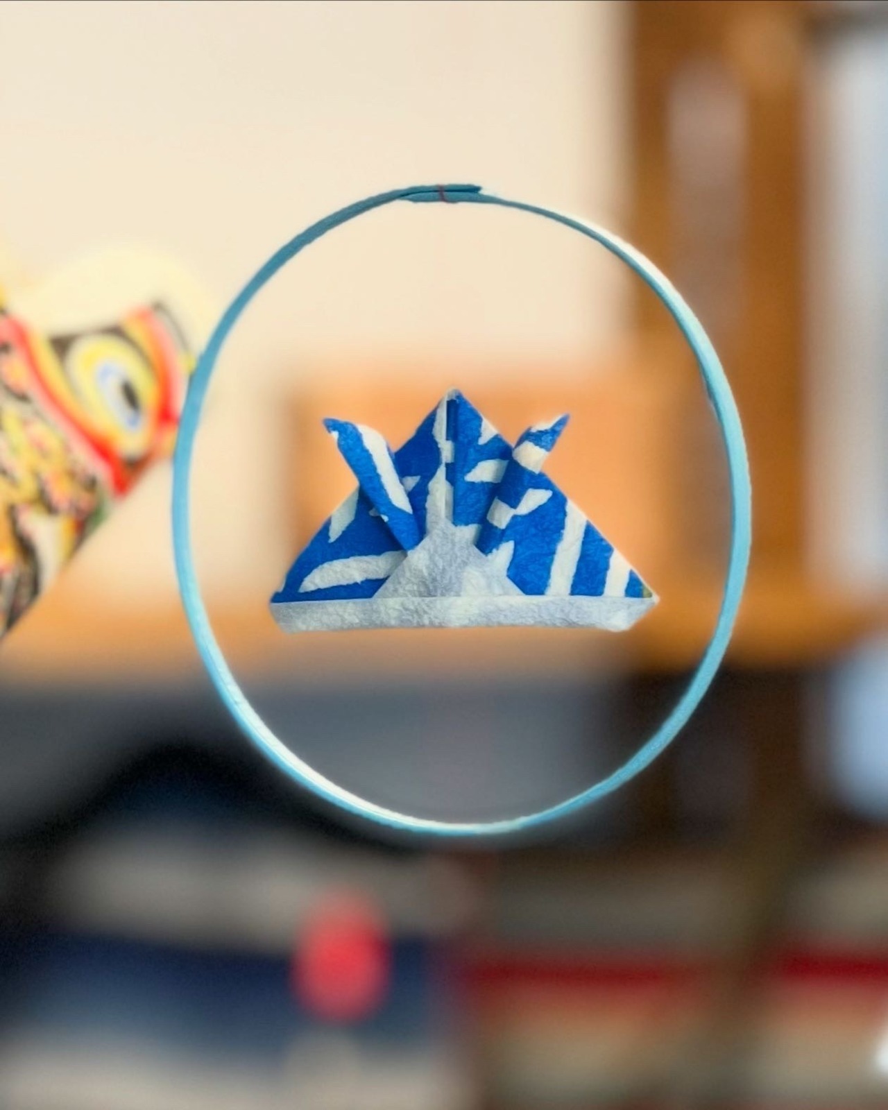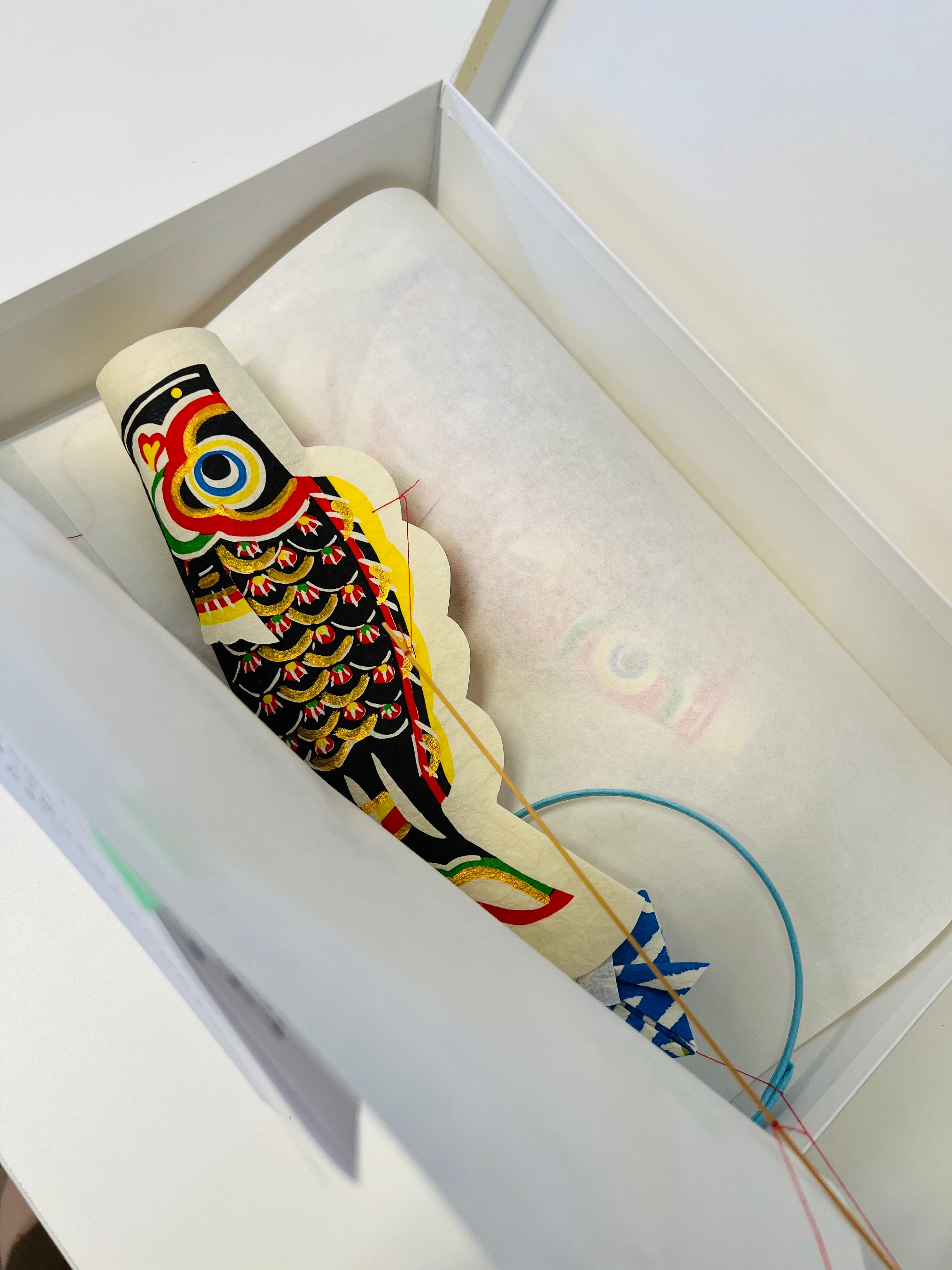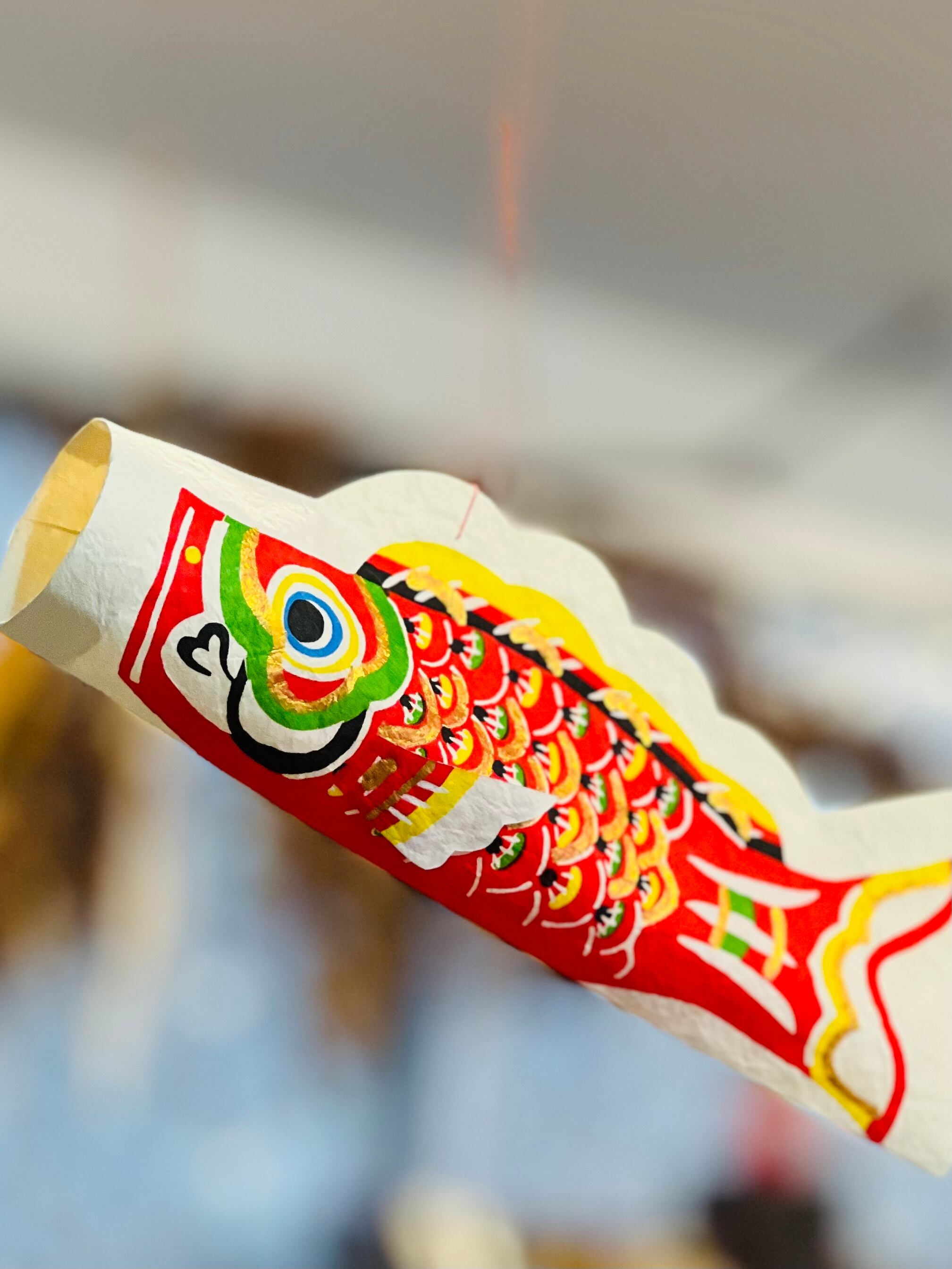 ひとつひとつ模様をつけられた和紙と、繊細な竹ひごで作られた和紙のモビールです。わずかな風を受けてゆったりとした鯉が優雅に泳いでいるように見えます。